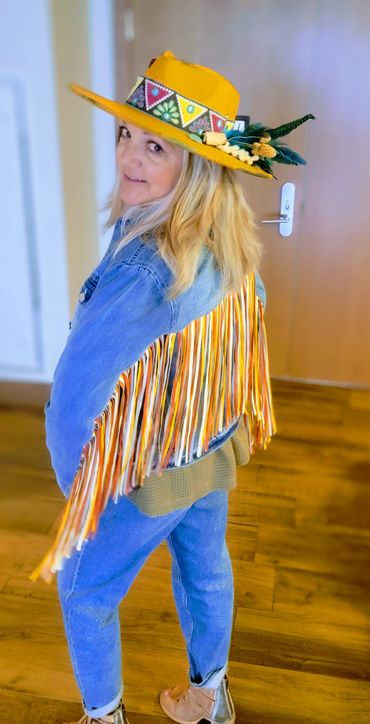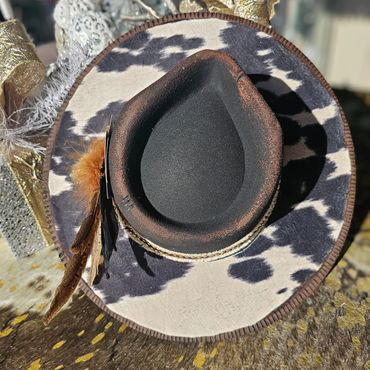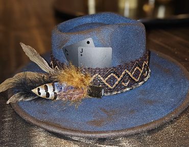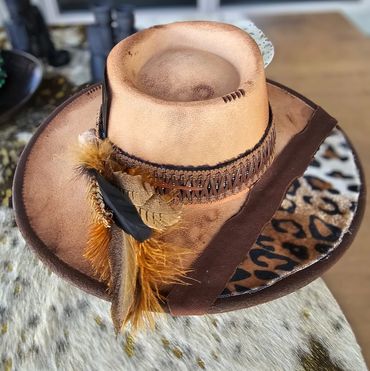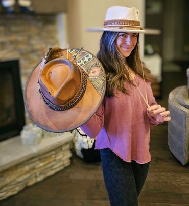 All eyes will be on you when you wear one of these beautifully crafted Rancher Babe Hats! A perfect statement piece with any outfit. Our owner, Susan, hand paints and creates each Babelicious rancher hat with paint, feathers, unique layered headbands and a variety of stones or whatever magically decides to appear on the unique hat. Plus, each hat has its' own name proudly displayed under the brim or under the crown.